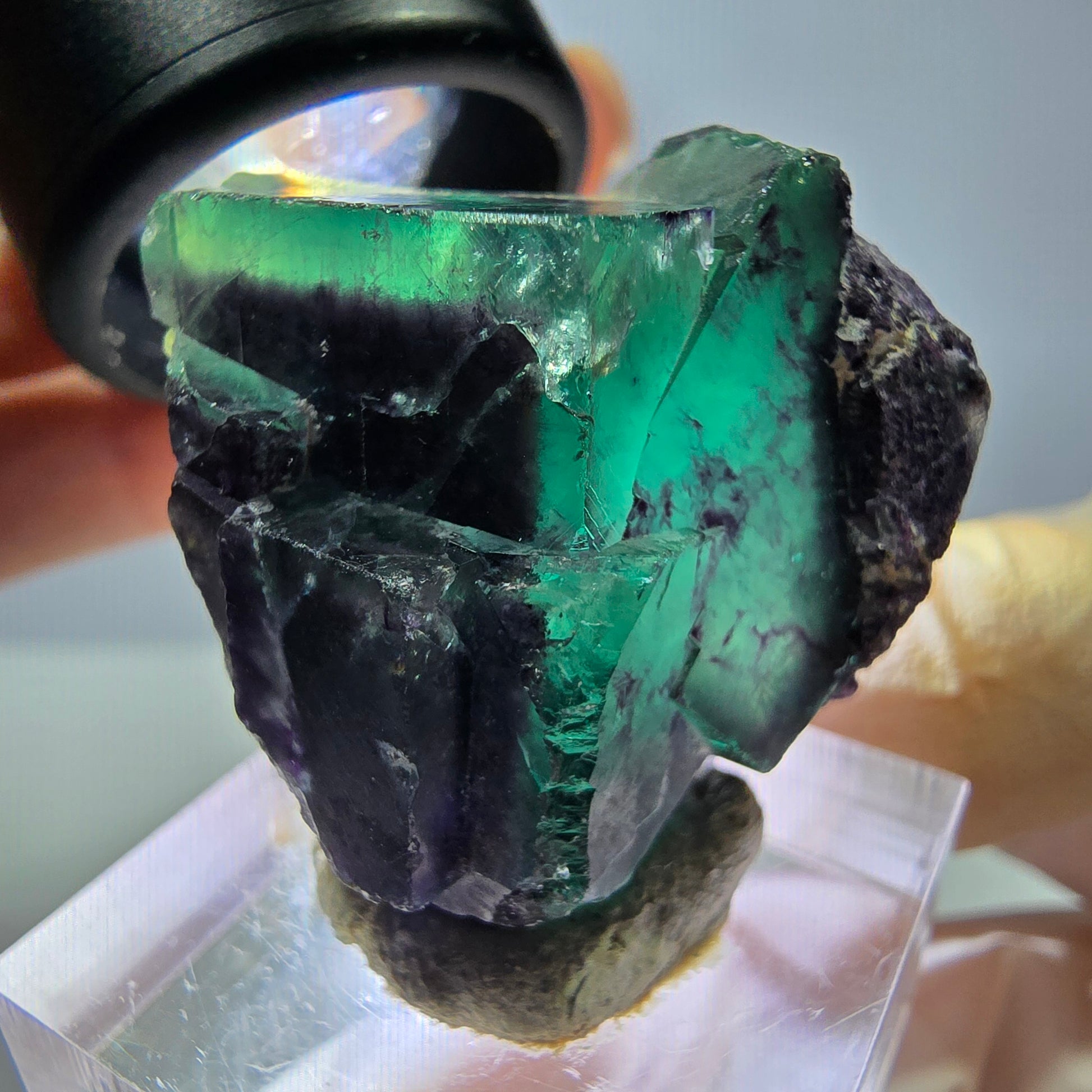 Diese seltene Phantom Fluorit Würfel Stufe aus Okorusu, Namibia besticht durch ihre transparenten grün-lila kubischen Kristalle mit faszinierenden Phantomen im Inneren. Mit den Maßen von 33 x 32 x 19 mm und einem Gewicht von 23 g ist sie eine kompakte Besonderheit für jede Mineralien-Sammlung.