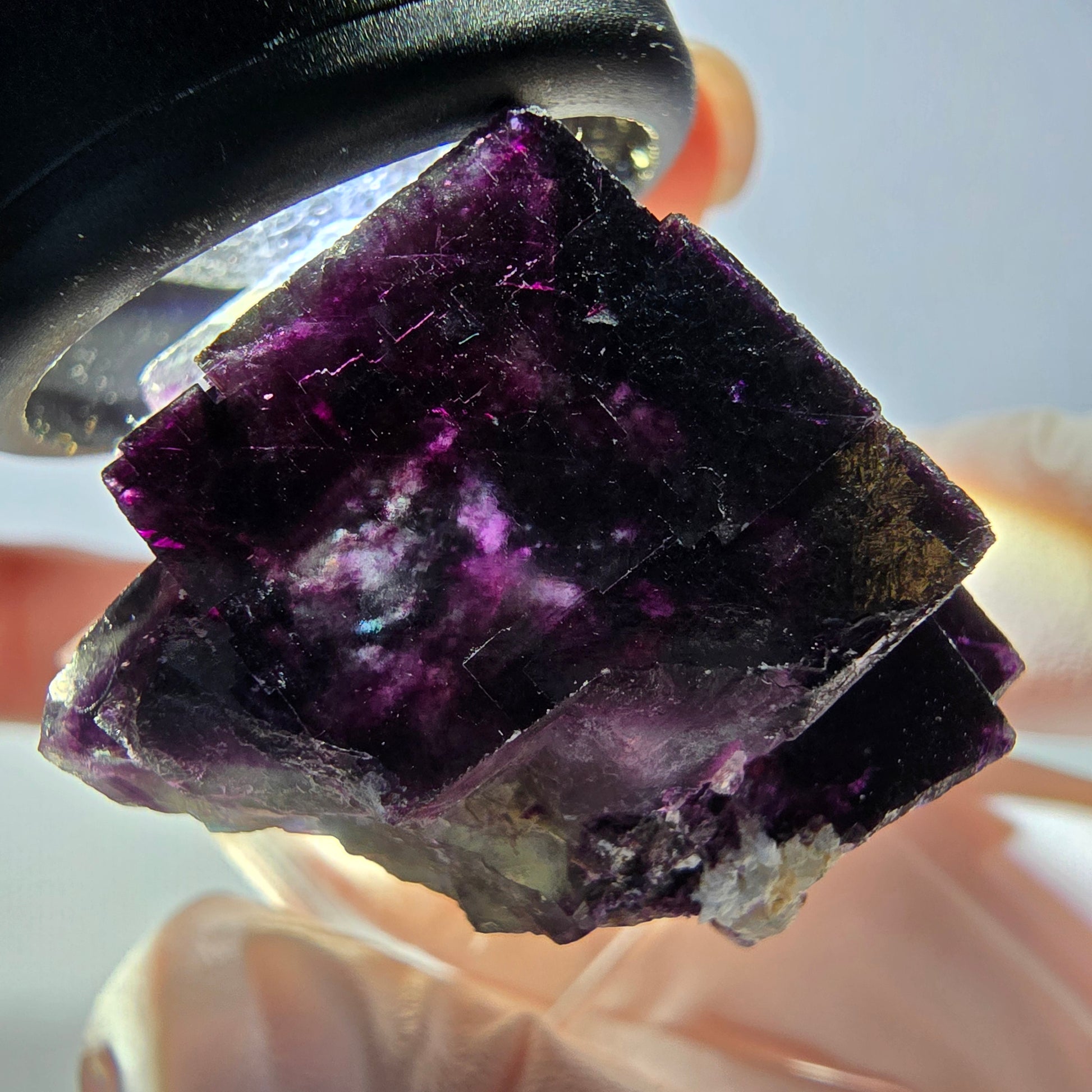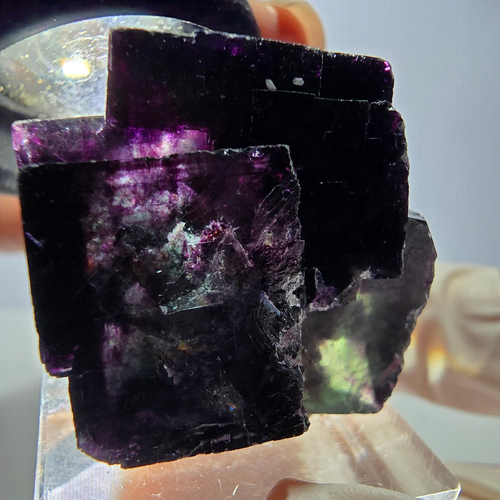 Diese exquisite Phantom Fluorit Würfel Stufe besticht durch ihre seltene grün-lila Färbung und transparente, kubische Kristalle aus dem berühmten Okorusu-Fundort in Namibia. Die beeindruckenden Phantome im Inneren machen dieses Stück zu einem absoluten Highlight für jeden ernsthaften Mineraliensammler. Mit den Maßen 35 x 34 x 25 mm und einem Gewicht von 31 g erhalten Sie ein wunderbar handliches Sammlerstück von höchster Qualität.