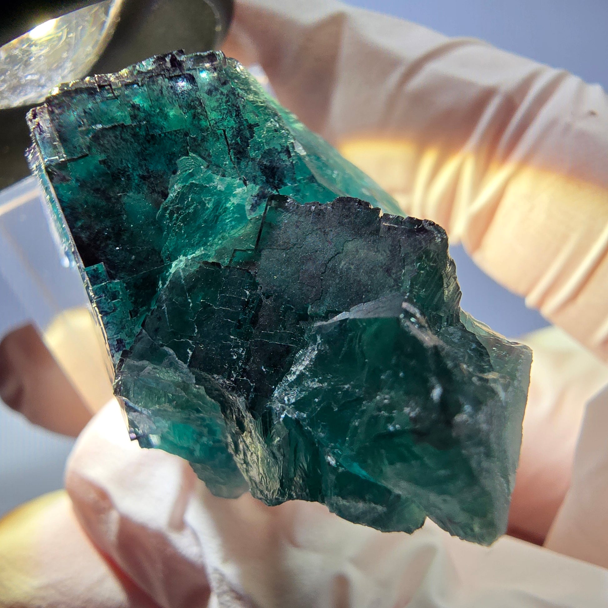 - Farbe / Besonderheit: Grün-lila, transparente Würfel mit Phantomen