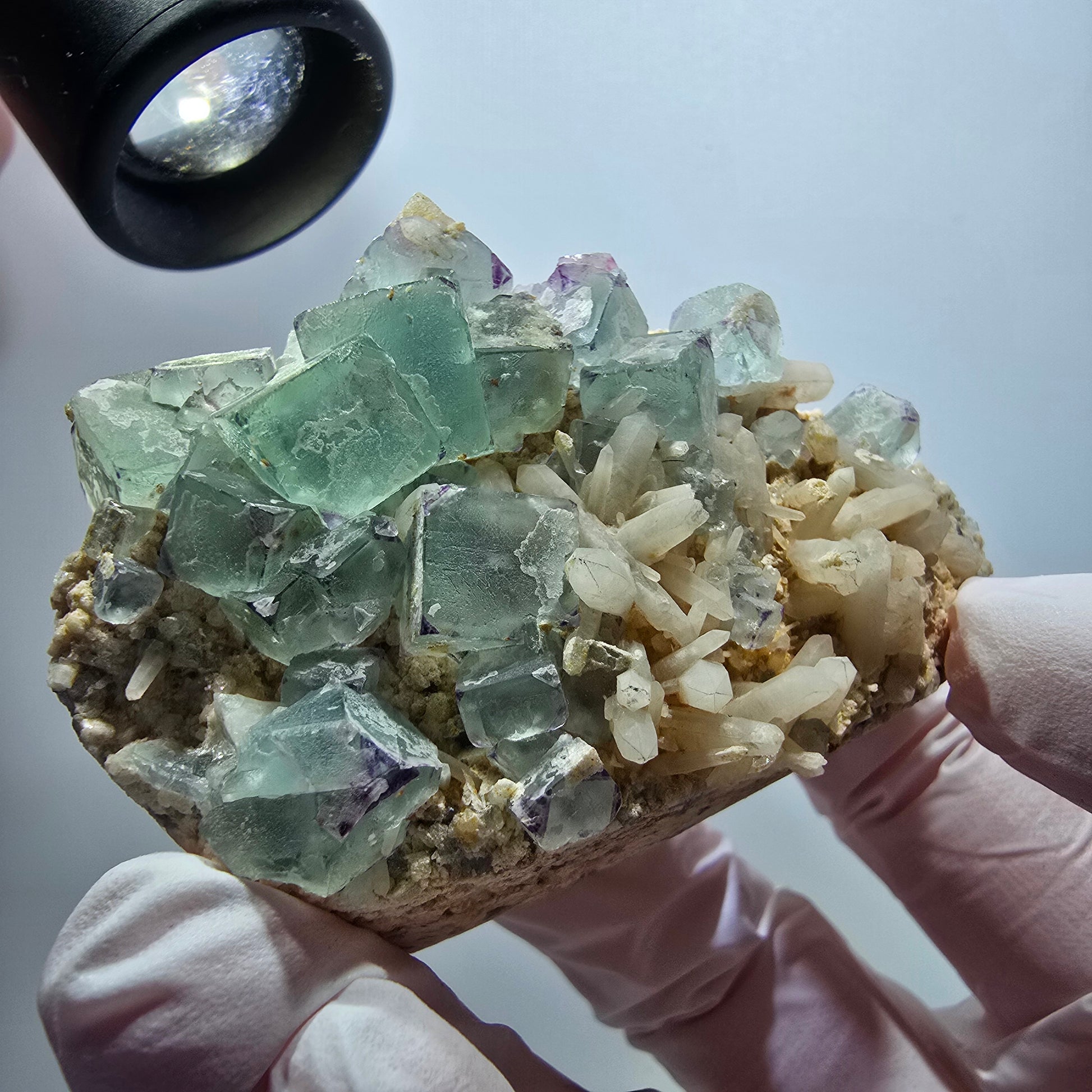 Entdecken Sie diese seltene Phantom Fluorit Würfel Quarz Stufe mit grün-lila zonalen Phantomkristallen im Inneren. Auf der Stufe thront weißer Quarz mit Kristallspitzen – ein echtes Highlight aus dem Brandberg, Namibia.