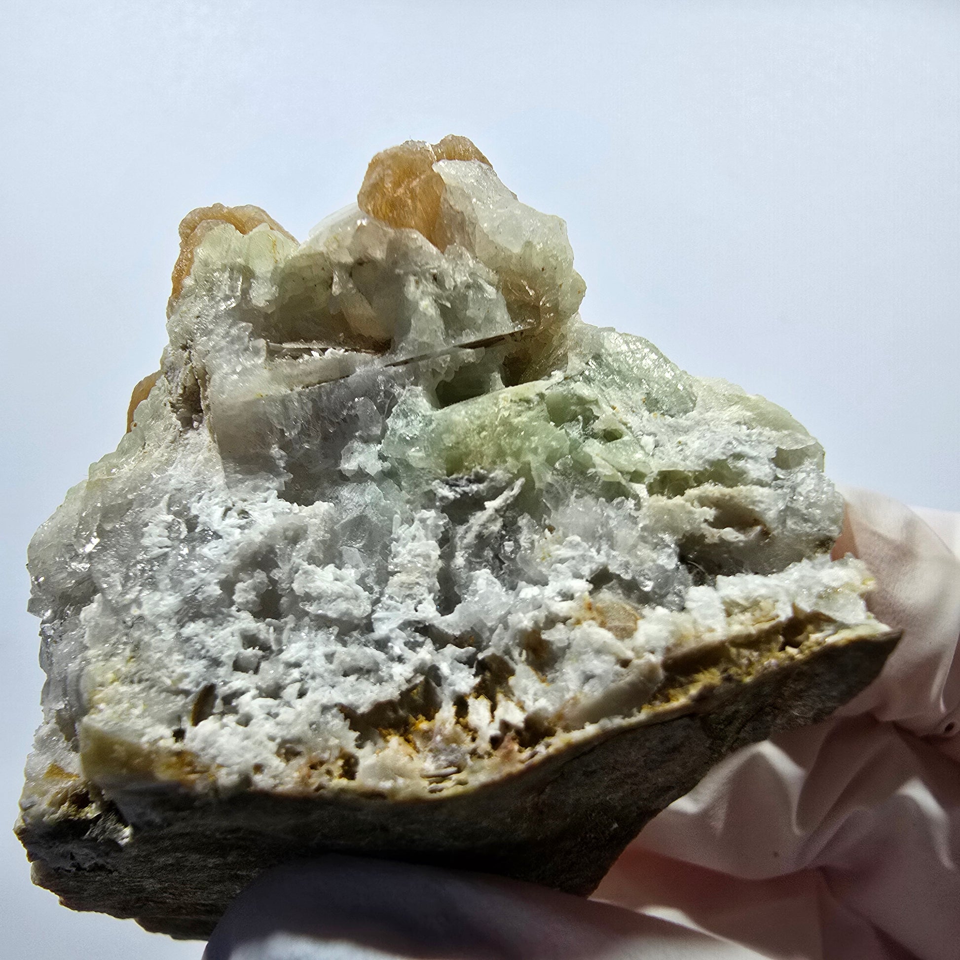 - Besonderheit: Seltene Kombination, grüne kugelige Prehnite, braune Stilbite, weiße Calcite