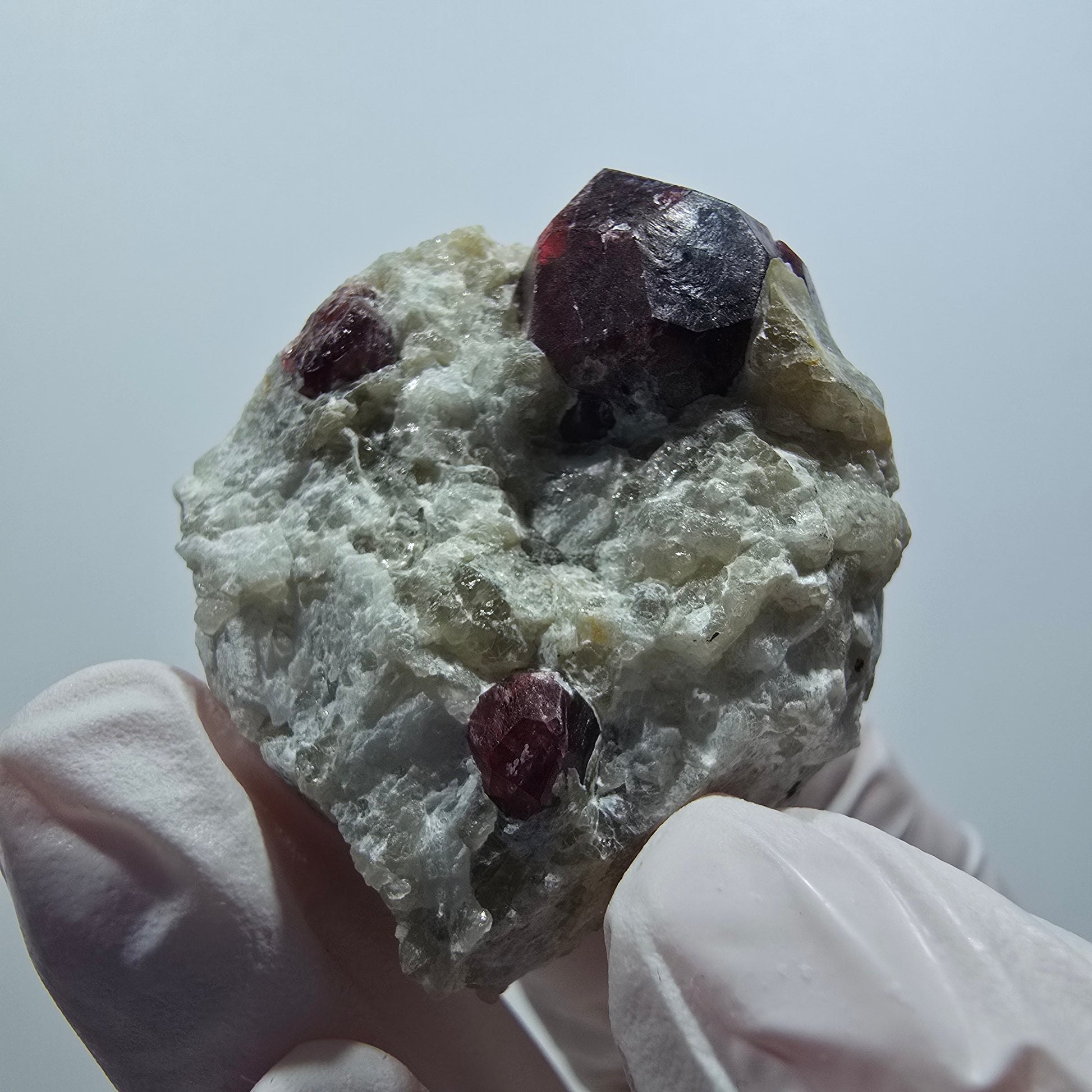 - Besonderheit: Kanig gewachsene, rot transparente Kristalle auf weißer Quarz-Matrix