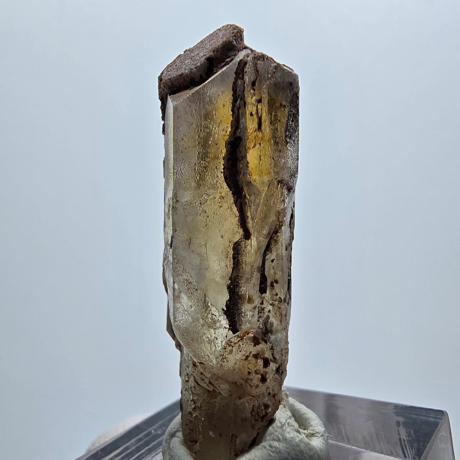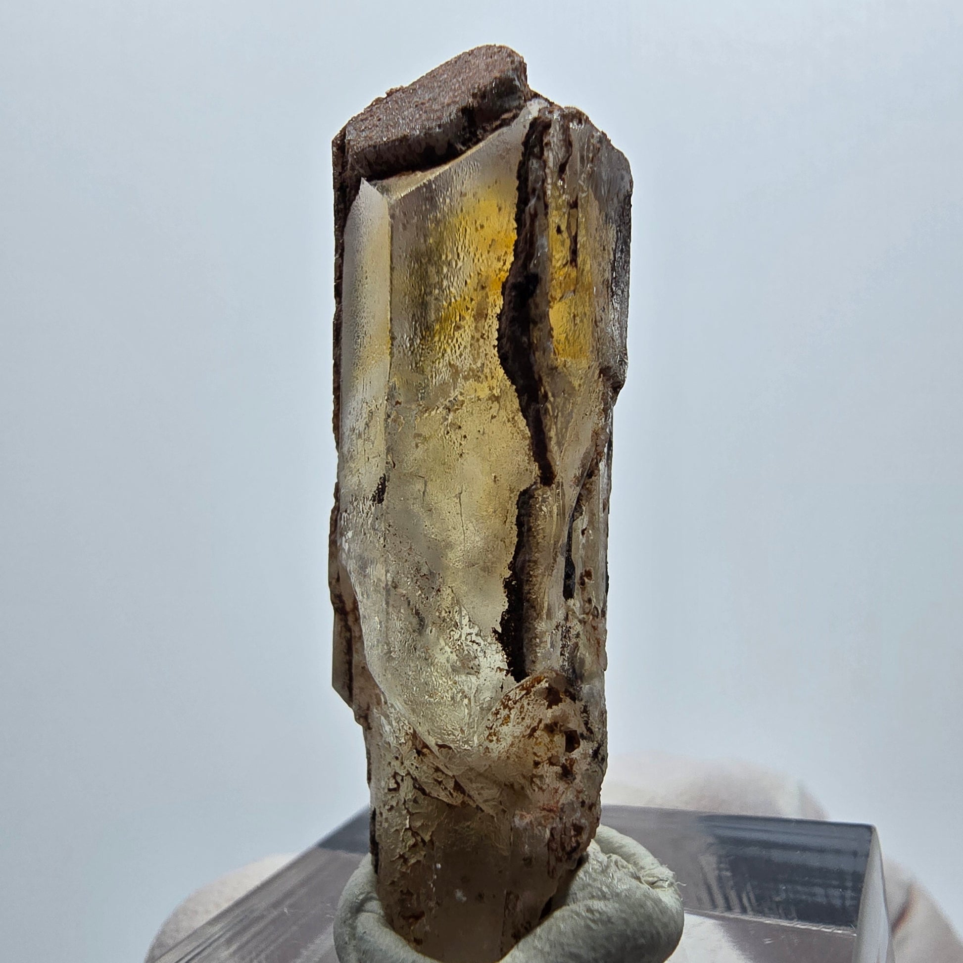 Seltener Baryt mit Enhydro-Einschluss aus dem legendären Brukkaros in Namibia – ein außergewöhnliches Sammlerstück für Mineralienliebhaber. Dieser klare, längliche Baryt-Kristall besticht durch braun-gelbe Kristallbildung und wunderbare Phantome im Inneren, gekrönt von einer beweglichen Flüssigkeitsblase (Enhydro). Ein einzigartiger Fund von diesem seltenen Fundort mit besonderer Transparenz und mineralogischer Faszination.
