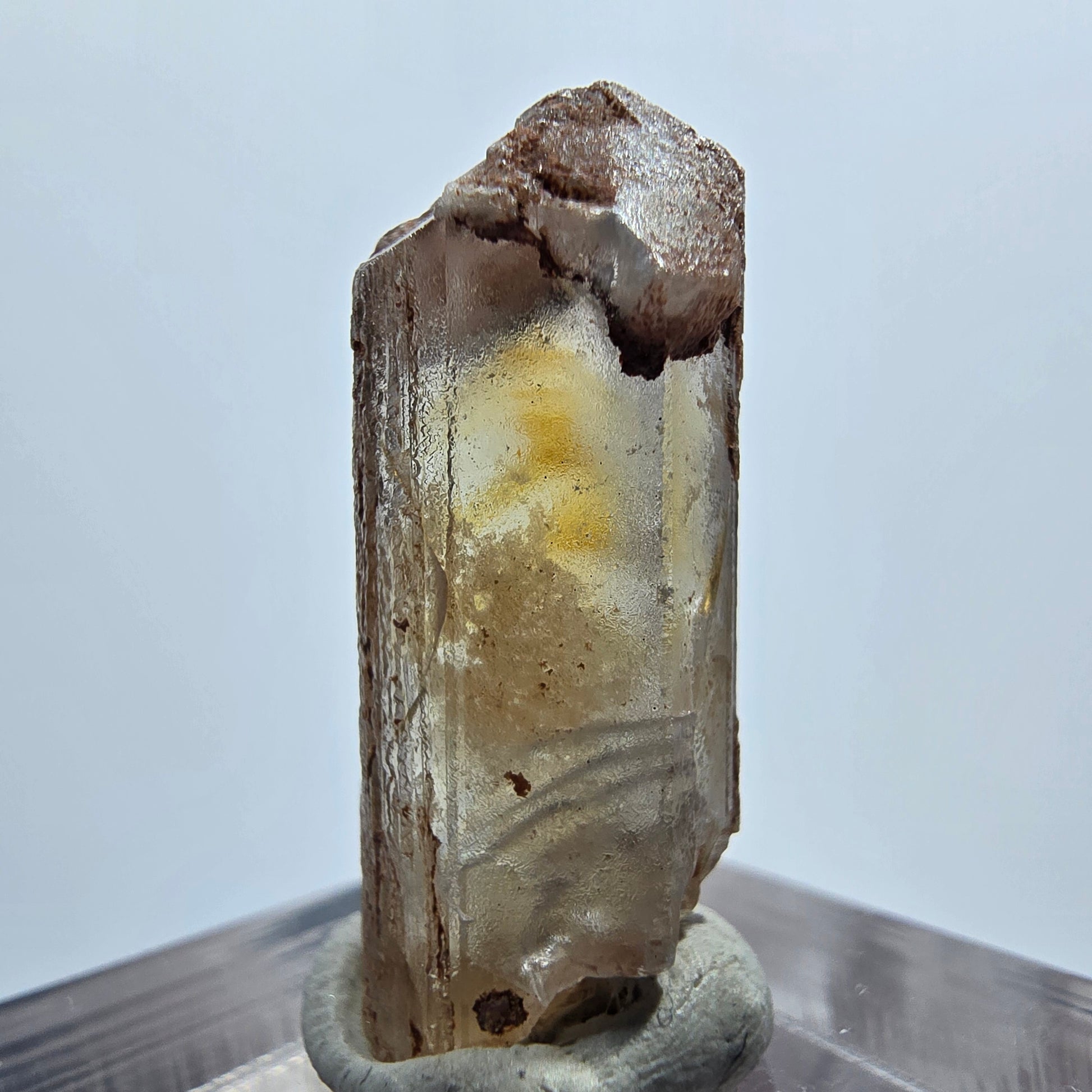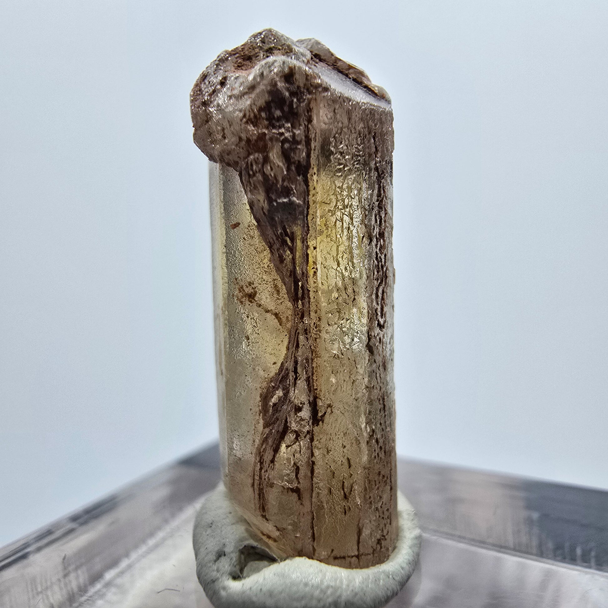 Dieser seltene Baryt-Kristall von Farm 426 aus dem Brukkaros-Komplex in Namibia ist ein echtes Sammler-Highlight. Das längliche Exemplar besticht durch seine braun-gelbe Färbung und beeindruckende Phantome im Kristallinneren. Brukkaros-Baryte sind selten am Markt anzutreffen und erzielen unter Mineraliensammlern hohe Wertschätzung. Dieses Stück bietet exquisite Klarheit und Transluzenz gepaart mit einer ungewöhnlichen Farbgebung.