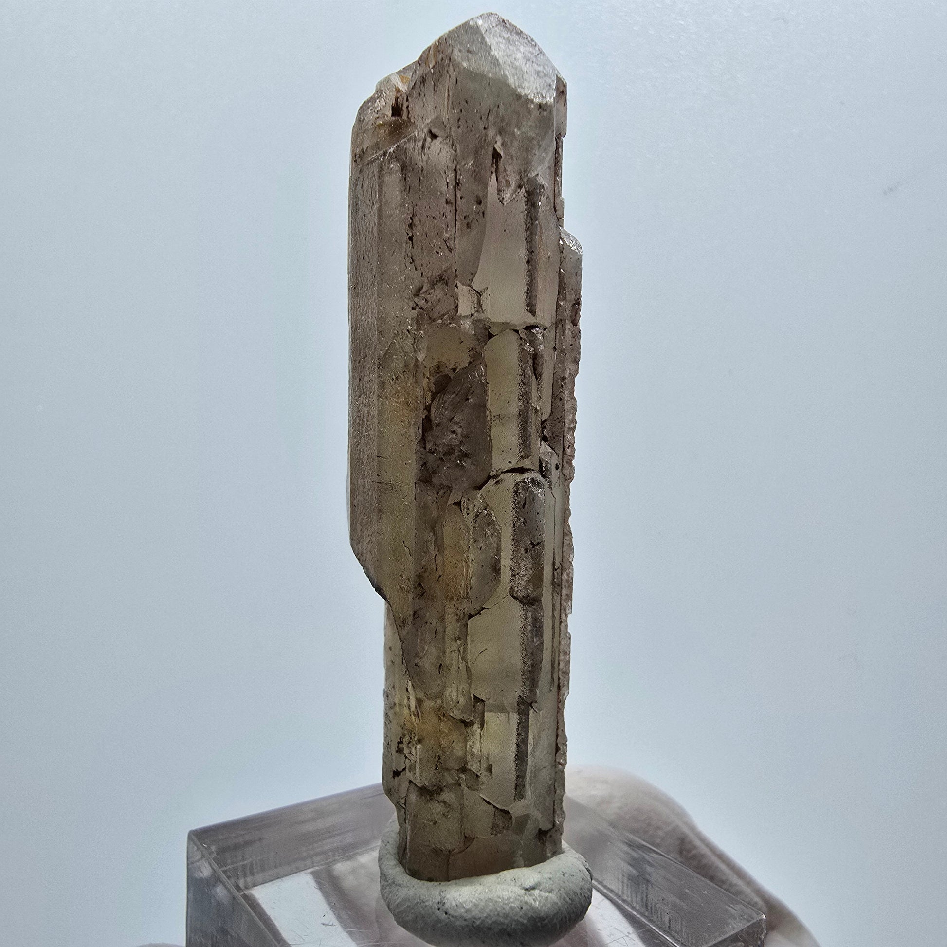 Dieser seltene, klar-längliche Baryt X Kristall aus Brukkaros, Namibia, zeigt eine einzigartige braun-gelbe Kristallbildung mit faszinierenden Phantomen im Inneren. Mit Maßen von 58 x 19 x 14 mm und einem Gewicht von 39 g ist dieses Mineral ein besonders hochwertiges Sammlerstück.
