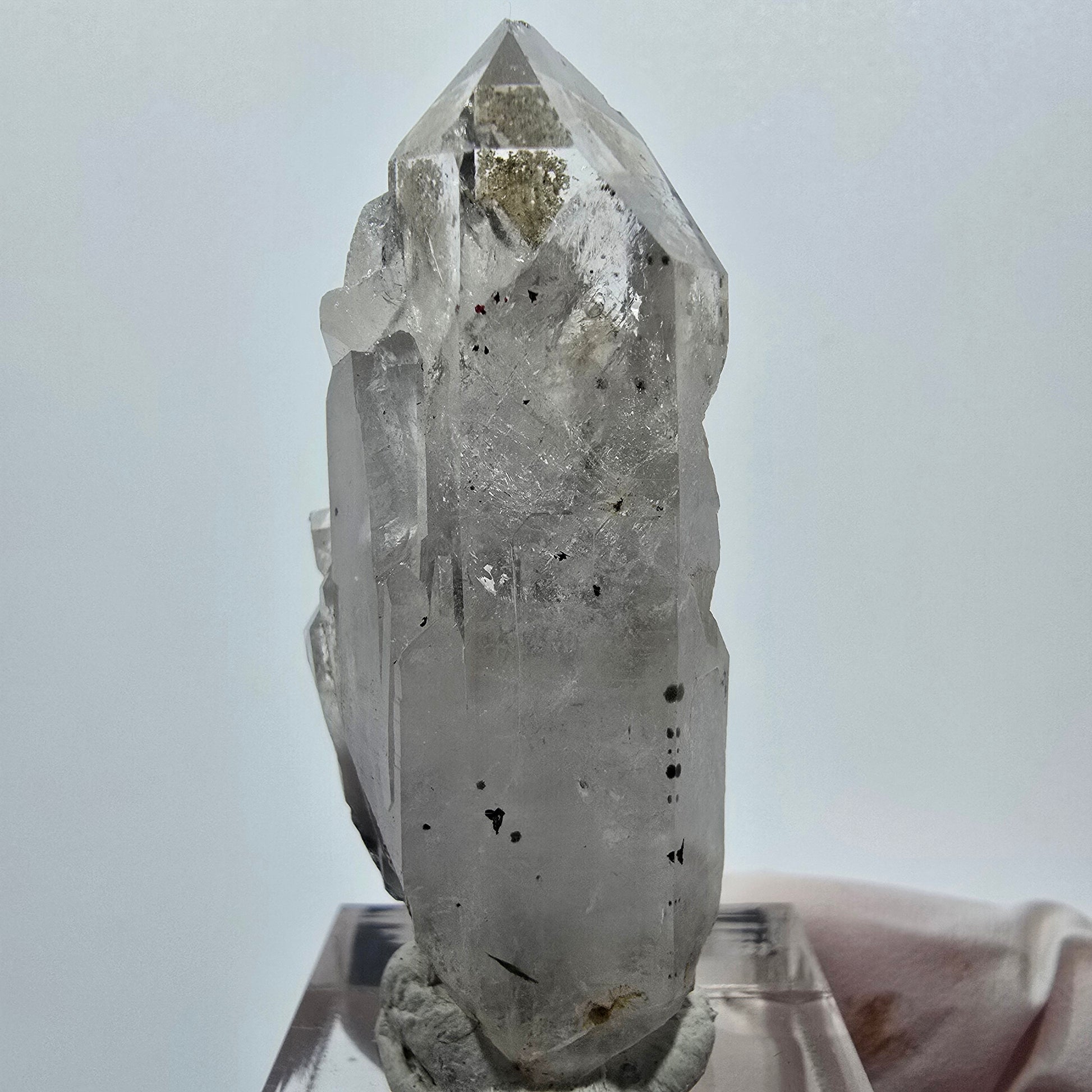 Diese seltene Skelett Phantom Quarz Stufe aus Goboboseb, Namibia, zeigt klare, weiß transparente Kristallspitzen mit einzigartigen Phantomen im Inneren. Auffällig sind die skelettartigen Oberflächenstrukturen sowie die schwarzen Hämatit-Einschlüsse, die diesen 50 x 24 x 18 mm großen Kristall besonders machen.