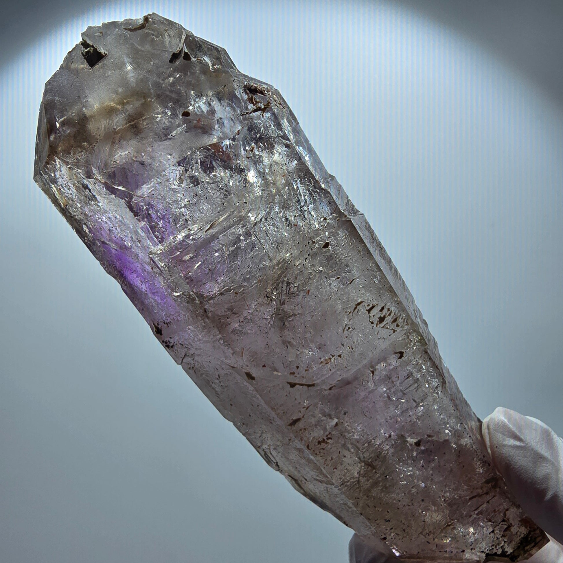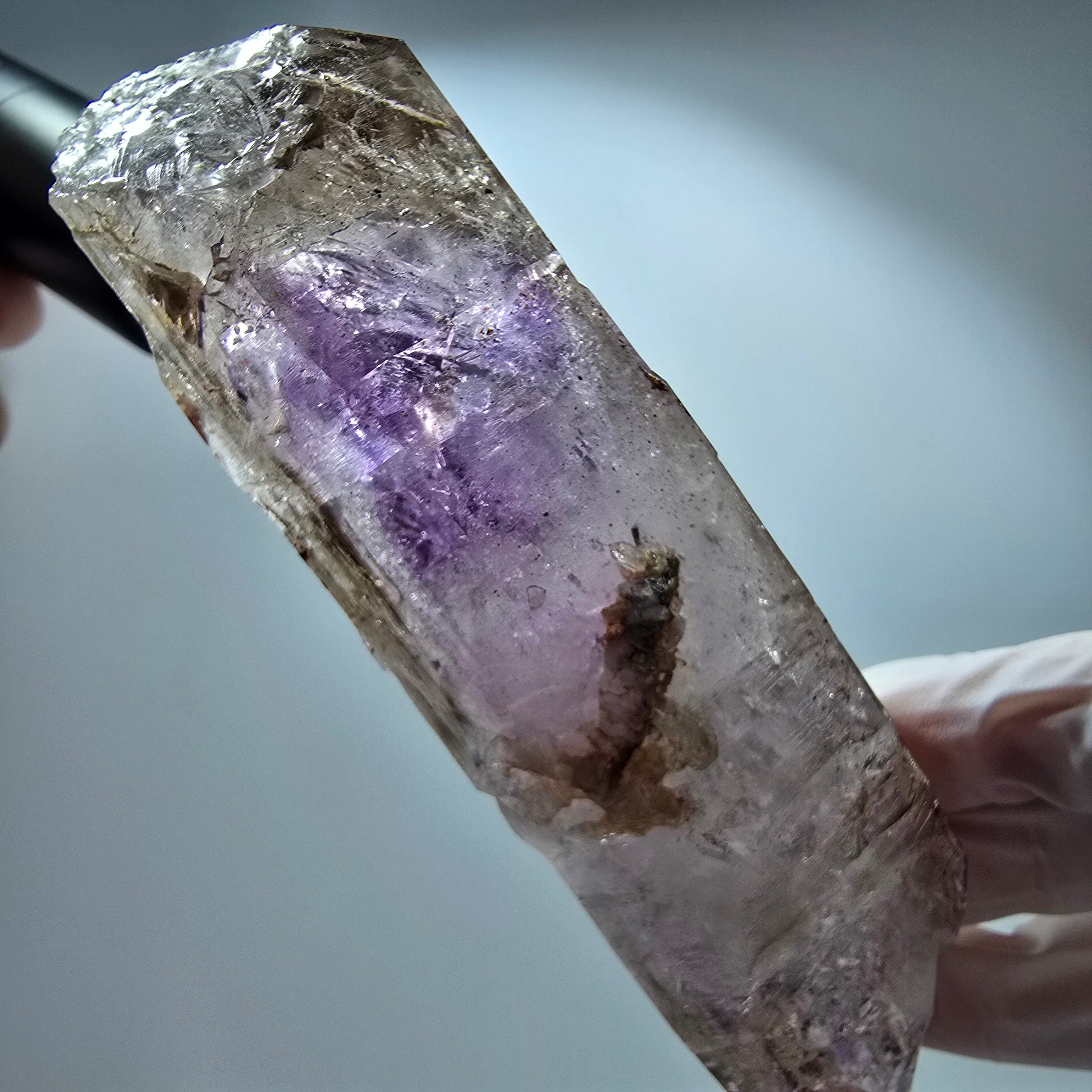 Entdecken Sie diesen XL Enhydro Skelett Phantom Amethyst DT Zepter aus Goboboseb, Namibia – eine seltene klare Phantom-Kristallspitze mit zepterförmiger Doppelender-Bildung und skelettartiger Oberfläche. Im Inneren begeistern lila und braune Phantome sowie drei Enhydro-Einschlüsse mit beweglichen Luftblasen. Maße: 138x44x37 mm, Gewicht: 303 g.